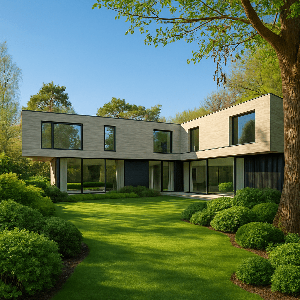 Foto is van een woning waar we een 5 tal jaar geleden de warmtepomp hebben geplaatst maar waar de tuin nog niet aangelegd was. Dus AI gevraagd die stijlvol aan te leggen met struiken en gras in een bosrijke omgeving, en ook hier moet je goed kijken of het echt is.
